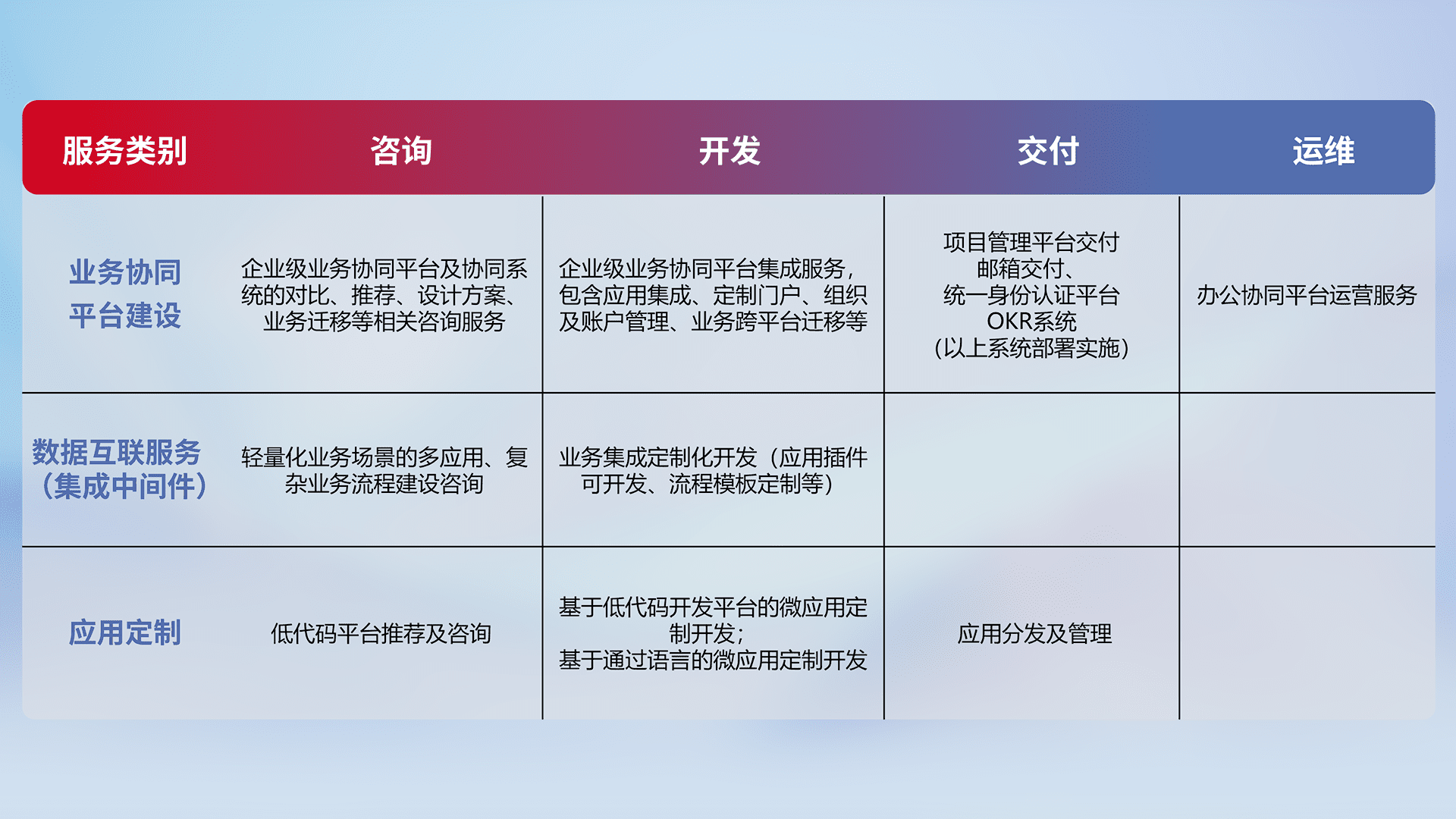 针对钉钉、、、、企微、、、、IDaas等平台级产品提供产品的规划、、、方案、、交付、、定制化开发等服务,,实现如统一协同办公、、、、智能客户服务、、、混合会议管理、、智能数据查询、、、等业务场景,,,实现数字化转型。。。