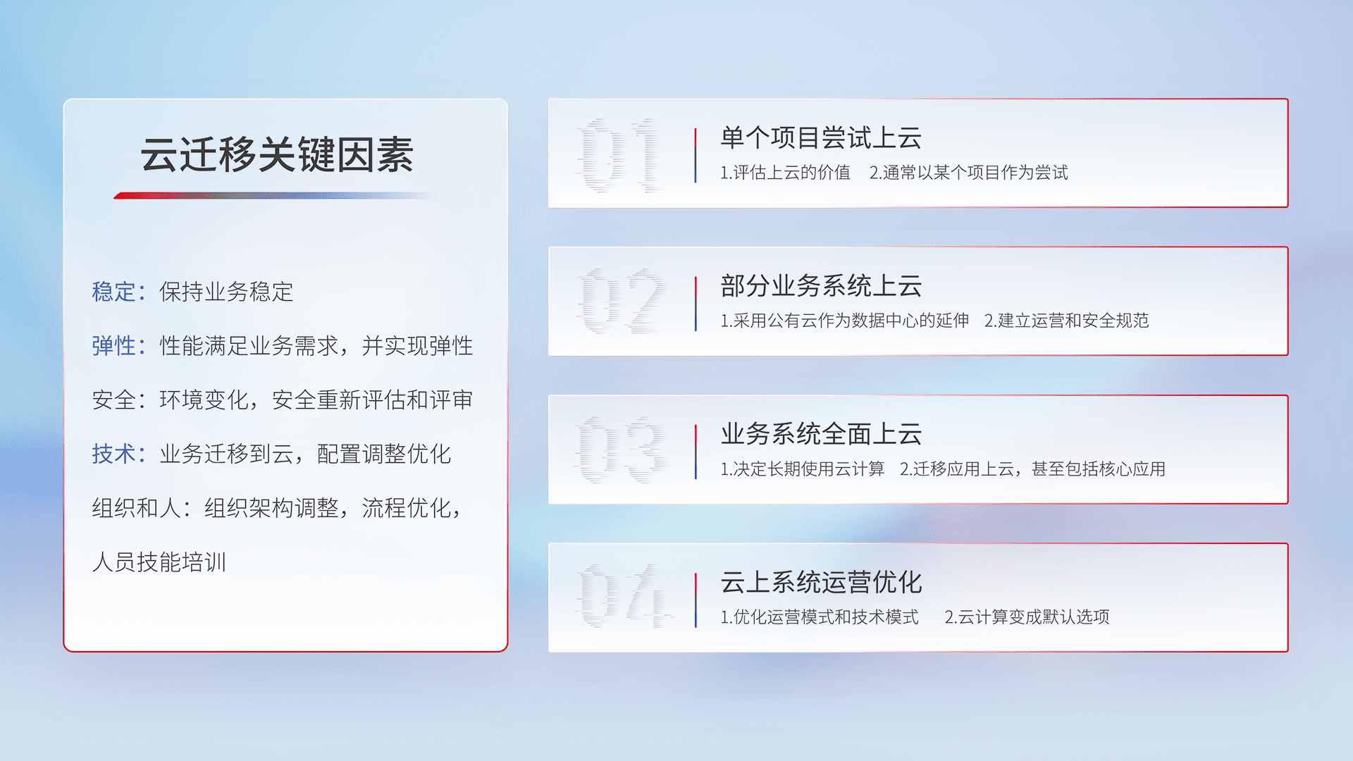 结合实际业务,,从规划设计、、云平台选型、、、、云原生改造、、、数据迁移、、集成交付,,,,迁移全过程为客户识别最佳上云路径,,,做好风险识别管理,,设计网络架构、、、、身份权限、、、、安全审计合规、、、操作审计、、、、日志审计、、监控告警策略、、、多站点容灾设计等,,,对云上基础设施进行整体规划,,提升IT治理水平,,以满足弹性、、、高可用、、高性能的需求。。。
